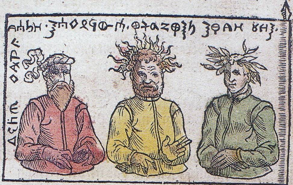 Rycina: Na górze bogowie pruscy – Patrimpsos, Perkun i Patollis, poniżej herb pruskiego władcy Widowuto według Simona Grunaua