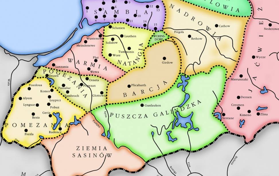 Podział plemion pruskich w XIII w., wg. M. Toeppena, Historia Mazur. Przyczynek do dziejów krainy i kultury pruskiej, Olsztyn 1995, Encyklopedia Warmii i Mazur