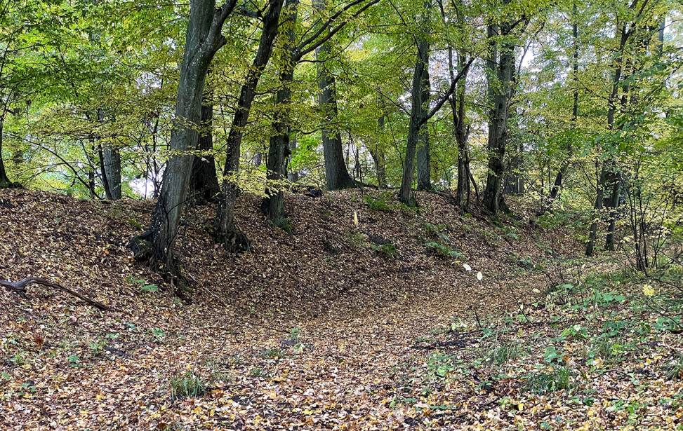 Zachowane wały ziemne na pruskim Grodzisku w Bogdanach (gm. Frombork)